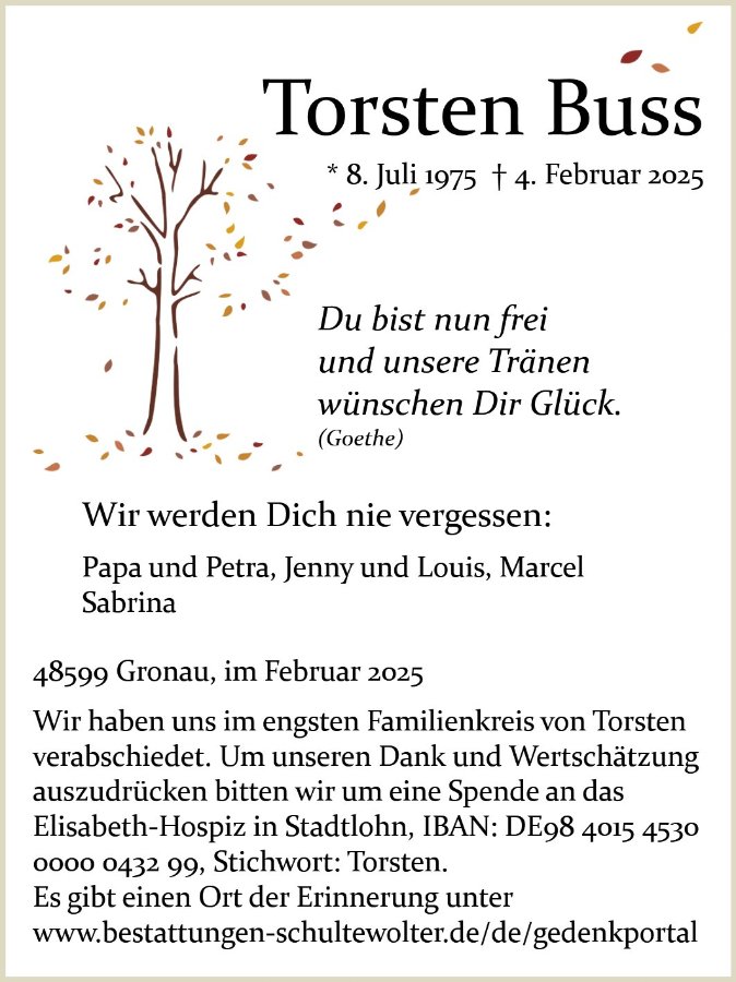 heute erst habe ich erfahren, das Torsten verstorben ist. Wir kannten ihn, er war oft in unserem Hause, wenn etwas kaputt war.